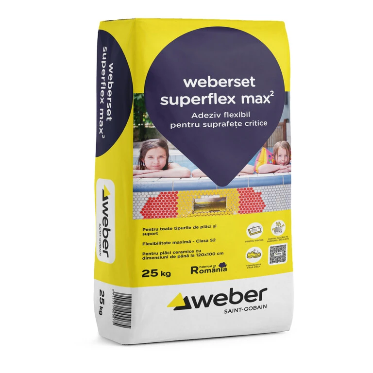 Pentru lipirea plăcilor de gresie şi faianţă cu absorbţie normală (Clasa BII, BIII) la interior, gresie porţelanată (Clasa BI), granitogres, klinker, marmură, piatră naturală, marmură compozită şi materiale de construcţii similare la interior şi exterior. Recomandat pentru încălzire prin pardoseală, terase neacoperite, piscine şi alte aplicaţii speciale ce necesită un adeziv super-flexibil de calitate profesională. Se aplică pe suporturi având ca liant cimentul: suprafeţe de beton, beton uşor, beton poros, tencuieli ciment, tencuieli var-ciment, tencuieli vechi, şape de ciment, pe gips-carton, pe hidroizolaţii (pe bază de ciment sau dispersie), lemn (OSB), metal. Este recomandat şi pentru lipirea plăcilor de gresie pe gresie sau faianţă pe faianţă. Împreună cu hidroizolaţia webertec superflex D2 sau webertec hydroprotect şi chiturile de rost din gama webercolor formează sistemul de hidroizolaţie pentru piscine weberhydro pool. * suprafaţa trebuie amorsată cu grundul universal weber GR100